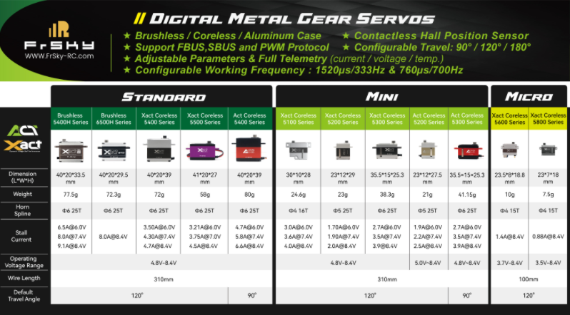 These high-quality servos support the FBUS protocol, which allows telemetry data (like real-time current, voltage, temperature, etc.) of Xact servos to be transmitted back to the radio by connecting either FBUS capable receiver or flight controller. The Xact servos offer configurable servo travel (90° / 120° / 180°). Servo travel along with other options are now available to be set via the ETHOS Xact configuration tool or the Freelink app.